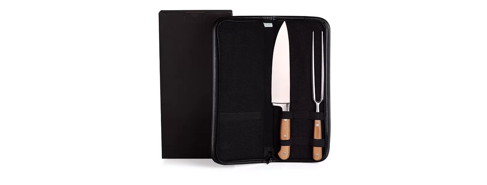 Conjunto de Faca em Bambu/Aço Inox. Acompanha faca 8.. e garfo em Bambu/Inox, com laminas forjadas Aço AISI420; estojo em Material Sintético. Dimensões do produto: xx Embalagem: Caixa Preta Dimensões da embalagem: 373x180x43 mm (AxLxP) Peso da embalagem: 265 g