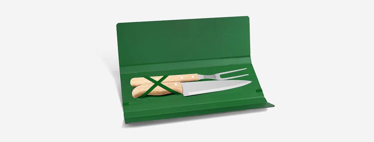 Conjunto composto por uma faca 7” e um garfo trinchante, ambos com cabos em Madeira e lâminas em Aço Inox. Estão organizados em uma pasta verde com elásticos. Dimensões do produto: Pasta: 33x10x2cm Embalagem: Plástica Dimensões da embalagem: 330x100x20 mm (AxLxP) Peso da embalagem: 260 g