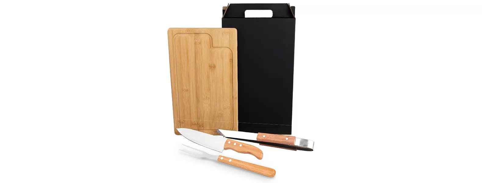 Kit para churrasco com pegador. Conta com tábua em Bambu com sulco retangular; Faca 8.. e garfo em Bambu/Inox; pegador em aço Inox/Madeira. Dimensões do produto: Tábua: 37×22,5×1,5cm Embalagem: Caixa preta Dimensões da embalagem: 400x235x50 mm (AxLxP) Peso da embalagem: 1.350 g