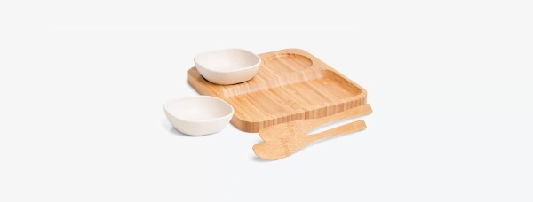 Conjunto para petiscos e patês em bambu/fibra de bambu. Acompanha dois potes em fibra de bambu, base e duas espátulas 14cm em bambu. Dimensões do produto: Base: 21,5x21cm / Pote: 9,5x3cm (cada) Embalagem: Caixa Preta Dimensões da embalagem: 220x220x50 mm (AxLxP) Peso da embalagem: 475 g