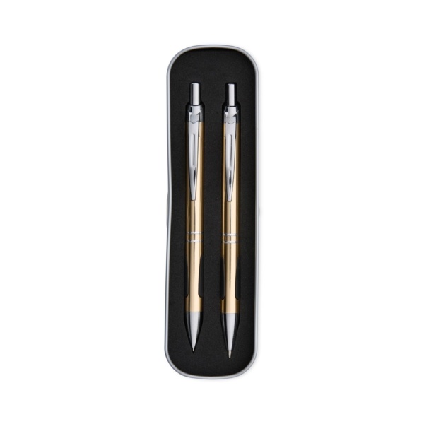 Conjunto de caneta e lapiseira metálicas em estojo de metal. Caneta e lapiseira possuem acabamento fosco, detalhe emborrachado na parte inferior, carga esferográfica azul de 1.0mm e acionamento por clique. Estojo revestido de veludo interno.