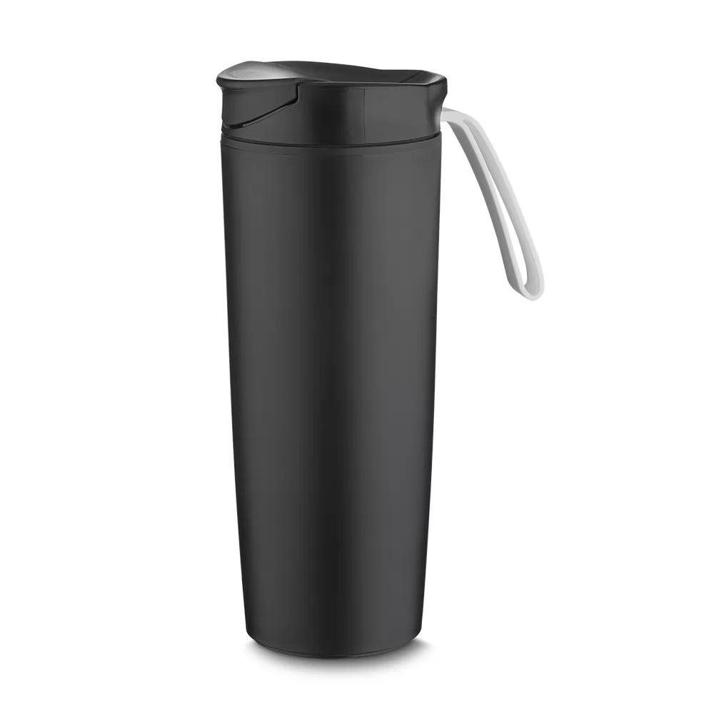 Copo plástico anti queda 400ml de pintura preto fosco com alça emborrachada colorida. Tampa rosqueável com abertura de bocal, parte inferior do produto possui ventosa.