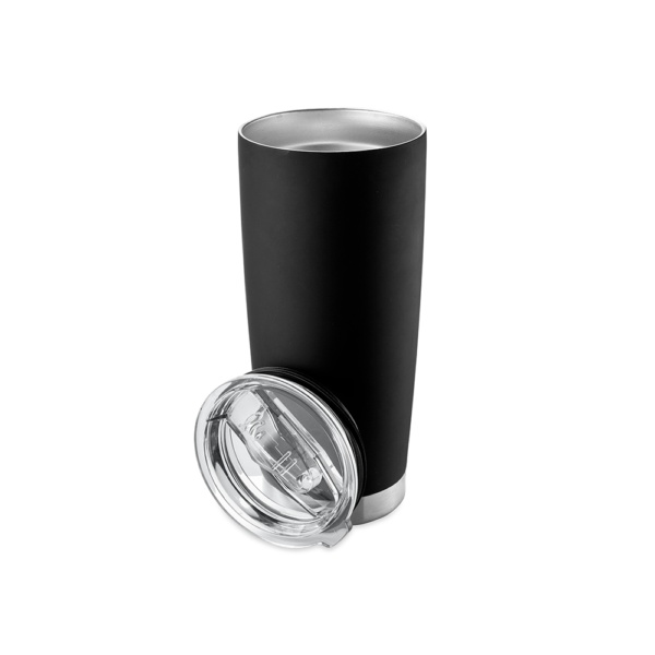 Copo térmico em inox com capacidade de até 500ml. Possui construção em parede dupla e tampa plástica com vedação a vácuo e bocal com trava de segurança, características que ajudam a conservar a temperatura de líquidos por mais tempo.