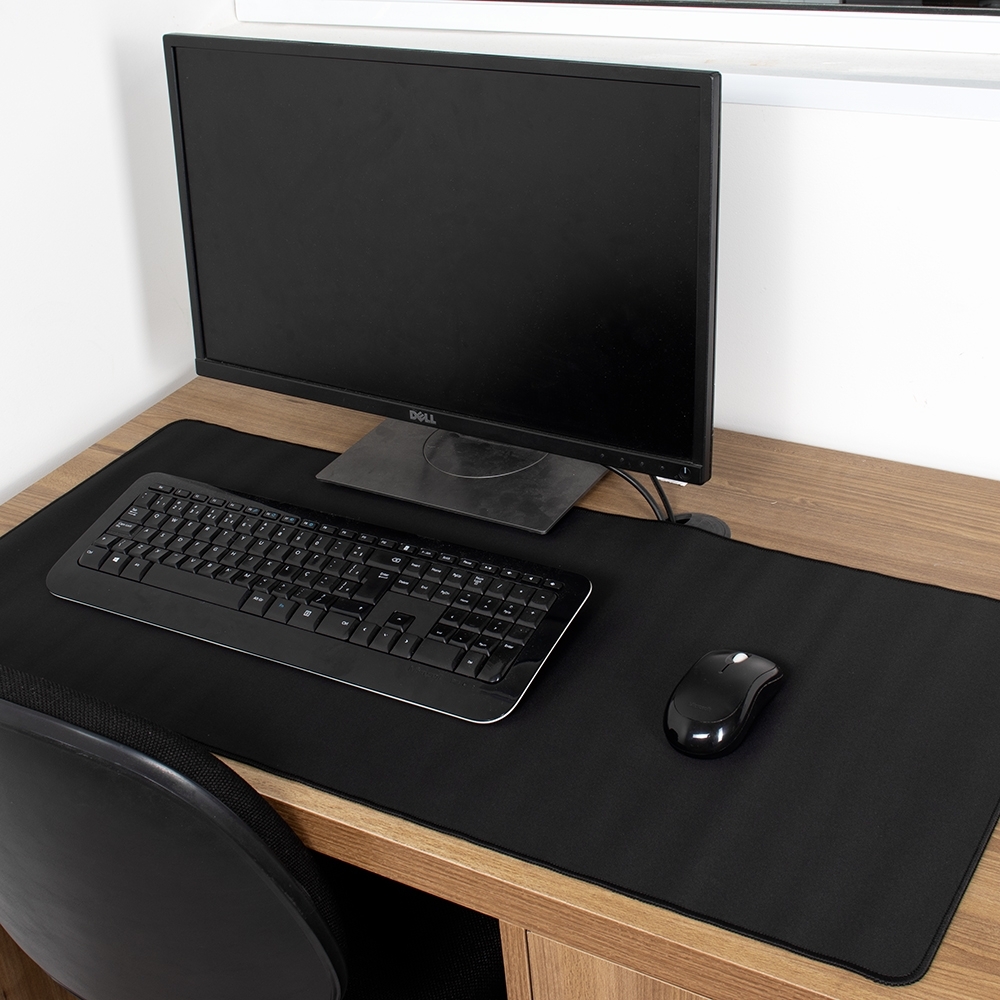 Desk pad confeccionado em poliéster com bordas arredondadas e base antiderrapante em EVA. Tudo isso oferece uma combinação de conforto durante o uso e uma proteção ampla para superfícies planas contra arranhões e outros tipos de desgaste.