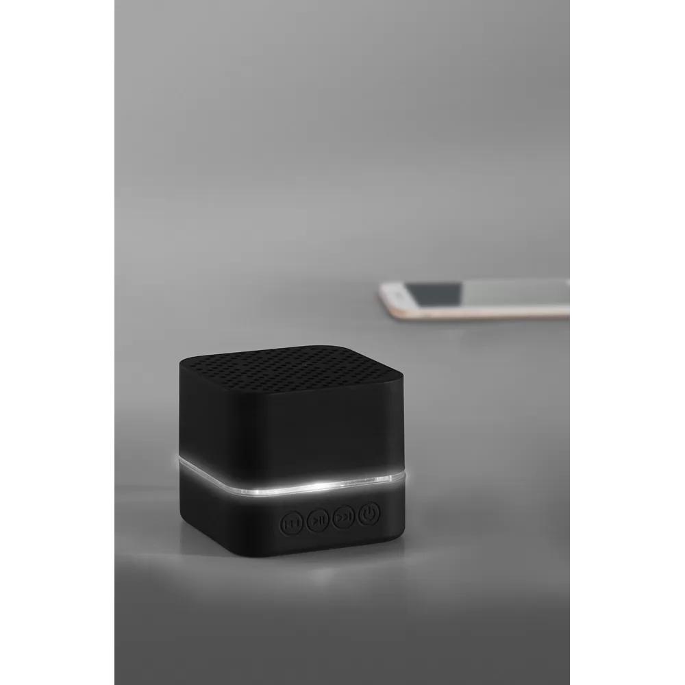 Caixa de som portátil, com luz LED no interior, em ABS e acabamento emborrachado. (personalizável com logótipo iluminado). Transmissão por bluetooth 4.2 e potência de 3W (4?). Bateria com 300 mAh e autonomia superior a 2h. Incluso cabo 2 em 1: USB / micro USB para carregamento e micro USB/3.5 jack. Fornecida em caixa. 59 x 59 x 51 mm