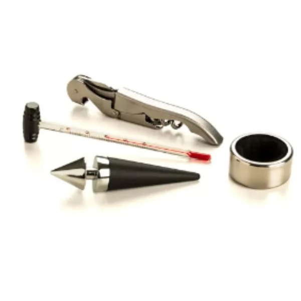 Acessórios para vinho em Metal com estojo em Bambu. Conta com espaço para a garrafa, tampão, termômetro, anel corta-gotas e abridor saca-rolhas. (NÃO ACOMPANHA GARRAFA)