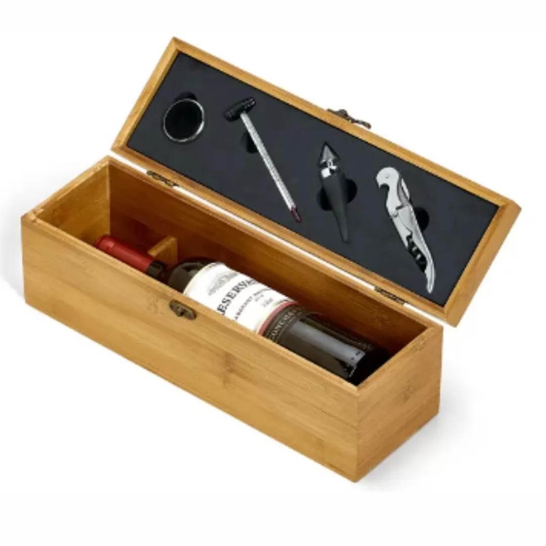 Acessórios para vinho em Metal com estojo em Bambu. Conta com espaço para a garrafa, tampão, termômetro, anel corta-gotas e abridor saca-rolhas. (NÃO ACOMPANHA GARRAFA)
