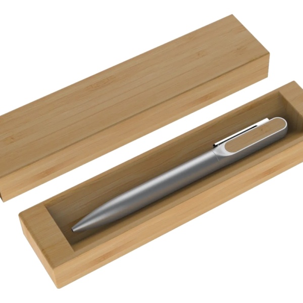 Estojo de papel para uma caneta com acabamento similar a bambu. OBS.: IMAGEM MERAMENTE ILUSTRATIVA, NÃO ACOMPANHA CANETA.