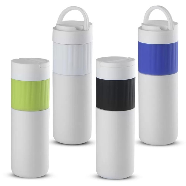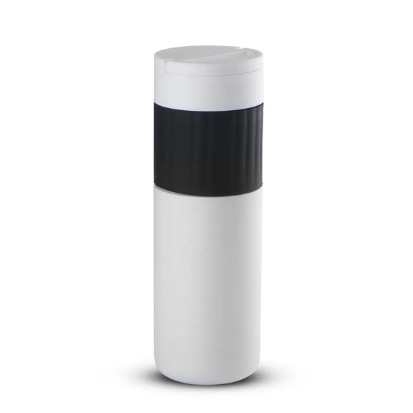 Garrafa térmica em aço inox com parede dupla isolada a vácuo, comcapacidade de até500ml. Conserva a temperatura quente ou fria, com alça e suporte para celular na tampa. Apoio para mão emborrachadoetampa rosqueável com anel de silicone para vedação.