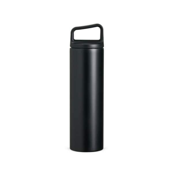 Garrafa térmica em inox, com parede dupla e capacidade de 600ml. A tampa é plástica rosqueável e possui alça acoplada.