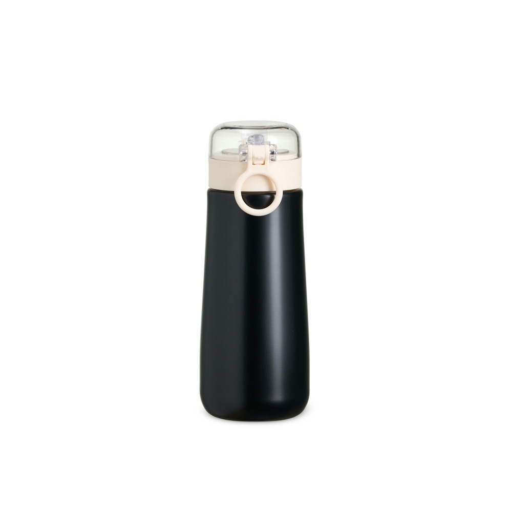 Garrafa Térmica feita em Inox 304, capacidade 500ml. Tampa rosqueável com botão de acionamento para abrir a tampa protetora do bocal. Acompanha bico de silicone e canudo plástico.