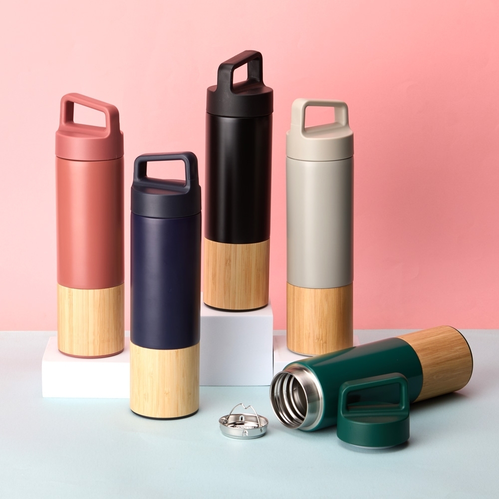 Garrafa térmica de 550 ml e infusor em inox, livre de BPA. Possui detalhe em bambu, tampa plástica com alça e base antiderrapante.