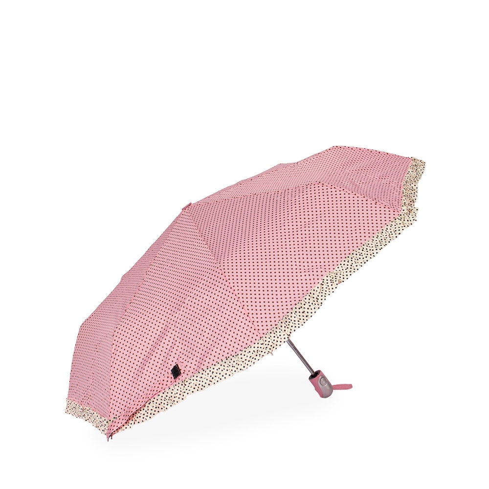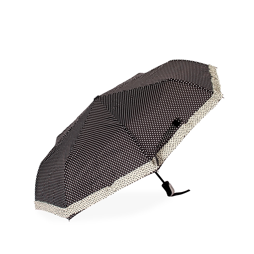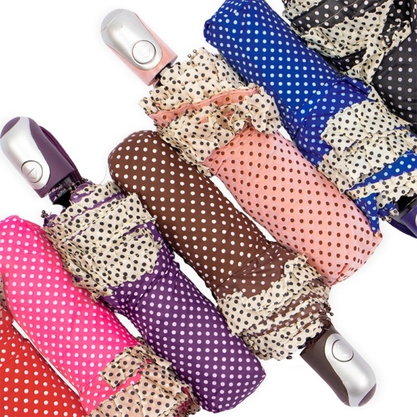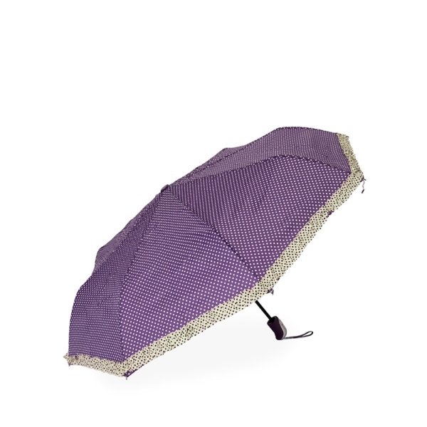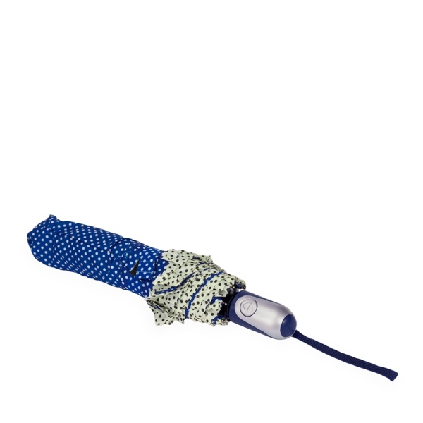 Guarda-chuva em poliéster com abertura automática por acionamento de botão. Possui estrutura metálica com oito varetas e pegador em plástico com alça de nylon fixa na ponta. Acompanha capa protetora.