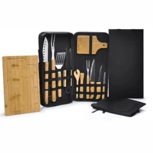 Conjunto para Churrasco/Cerveja; Acompanha tábua com três furos em Bambu; faca 8” e garfo em Bambu/Inox; Duas taças de Cerveja em vidro; Espaço para garrafa com palha (NÃO ACOMPANHA GARRAFA). Como cortesia, na faca 8″ fazemos uma gravação com os cortes do boi.