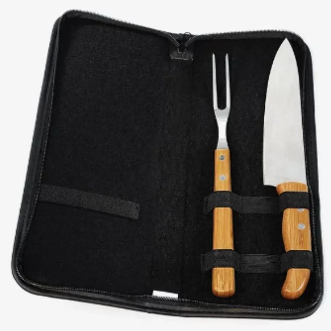 Composto por uma faca 8” e um garfo trinchante, ambos com cabos em Bambu e lâminas em Aço Inox com rebites resistentes. Estão organizados em fita elástica preta no interior de um estojo confeccionado em poliuretano preto com toque almofadado, fechamento em zíper e acabamento em costura lateral.