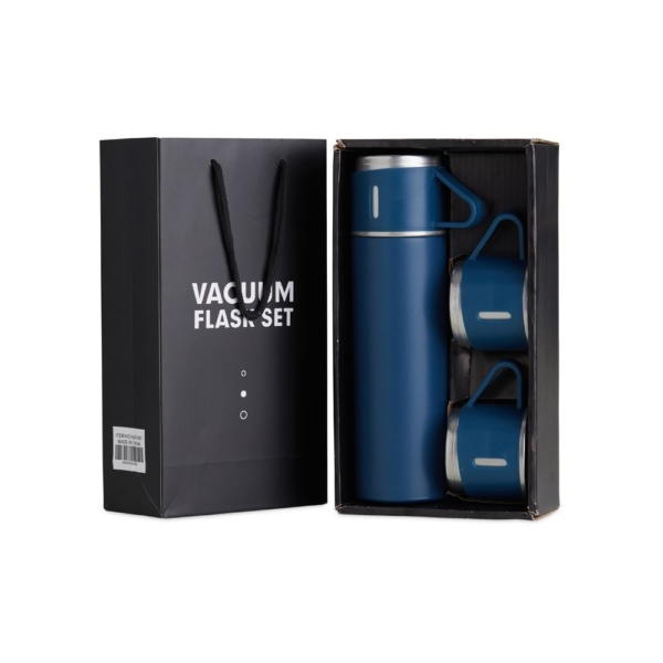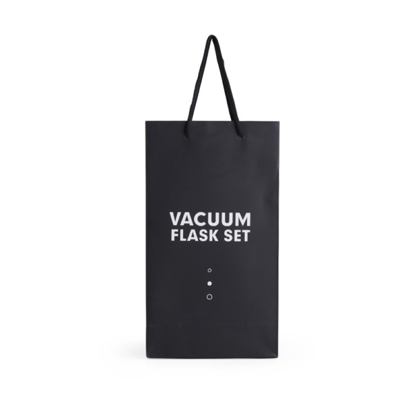 Kit garrafa térmica 450ml com duas tampas extras que podem ser utilizadas como xícaras. Garrafa produzida em inox com base antiderrapante e tampas de inox com revestimento plástico. Acompanha sacola de papel com berço de papelão para acomodação das peças. OBS.: SACOLA CUSTOMIZADA FRENTE E VERSO – VACUUM FLASK SET.
