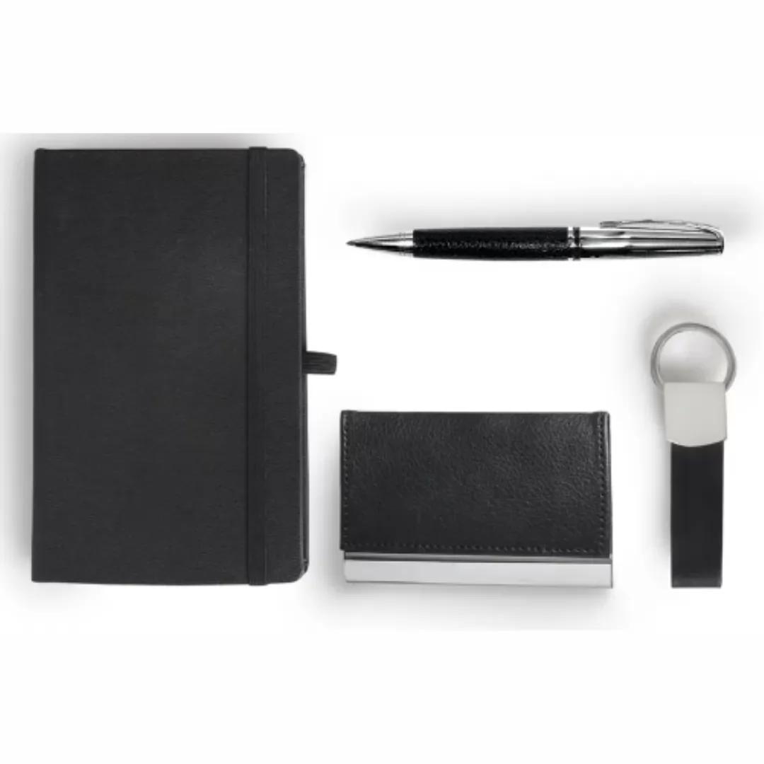 Kit office. Conta com uma caderneta de 80 folhas preto; porta-cartão em material sintético preto texturizado e metal cromado para aproximadamente 20 cartões; caneta esferográfica em metal com corpo revestido em material sintético preto texturizado; chaveiro em metal com material sintético preto.