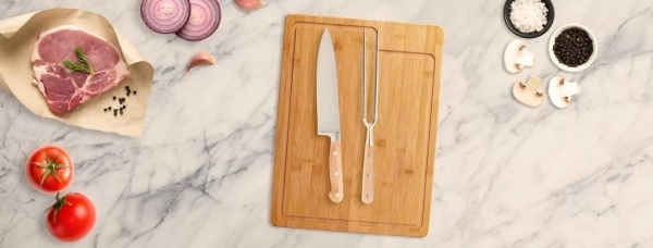 Conjunto para Churrasco em Bambu/Aço Inox; Conta com tábua em Bambu; Faca 8.. e garfo em Bambu/Inox. Laminas forjadas Aço AISI420. Dimensões do produto: Tábua: 40x30x2cm Embalagem: Caixa Preta Dimensões da embalagem: 425x325x65 mm (AxLxP) Peso da embalagem: 2.220 g