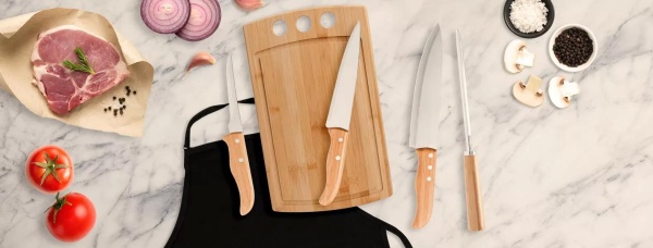 Kit Para Cozinha Em Bambu / Inox Com Avental – 6 PÇs
