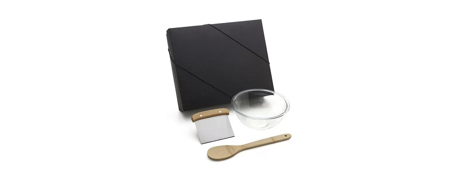 Kit para Cozinha; Acompanha colher 30cm em Bambu; Espátula multiuso em Bambu/Inox; Tigela em vidro. Acomodados em uma linda caixa para presente. Rebites em Aço Inox 304, um dos mais resistentes à ferrugem e corrosão. Dimensões do produto: Espátula: 13,5×11,5cm Embalagem: Caixa Preta Dimensões da embalagem: 365x300x100 mm (AxLxP) Peso da embalagem: 600 g
