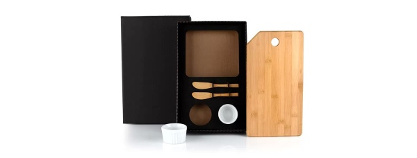 Kit para Petisco contendo tábua com furo e duas espátulas 14cm em Bambu; dois ramekins, um pequeno e um mini em porcelana. Estão perfeitamente acomodados em uma caixa para presentear. Dimensões do produto: Tábua: 32x17x1,2cm Embalagem: Caixa Preta Dimensões da embalagem: 350x225x65 mm (AxLxP) Peso da embalagem: 845 g