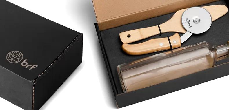 Kit para Pizza contendo cortador em Bambu/Inox; Espátula em Bambu; Garrafa para Azeite em vidro. Rebites em Aço Inox 304, um dos mais resistentes à ferrugem e corrosão. Dimensões do produto: Garrafa: 500ml Embalagem: Caixa Preta Dimensões da embalagem: 315x180x65 mm (AxLxP) Peso da embalagem: 640 g
