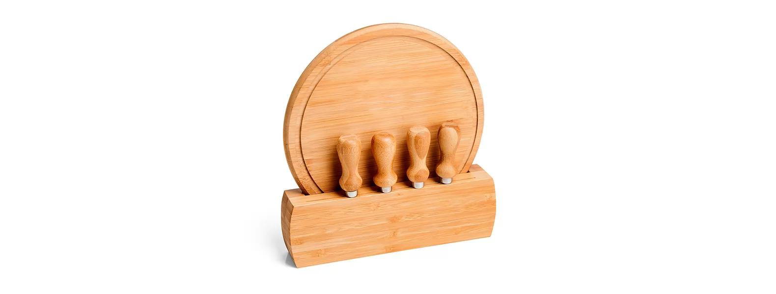 Kit para Queijo; Conta com tábua redonda e suporte em Bambu; Duas facas, uma espátula e um garfo para Queijos. Tábua confeccionada com tripla camada invertida, para dar maior durabilidade e não deformar com o passar do tempo. Dimensões do produto: Tábua: 21 x1,2 cm / Base: 23 x 7 x 4 cm Embalagem: Caixa Preta Dimensões da embalagem: 240x240x50 mm (AxLxP) Peso da embalagem: 1.070 g