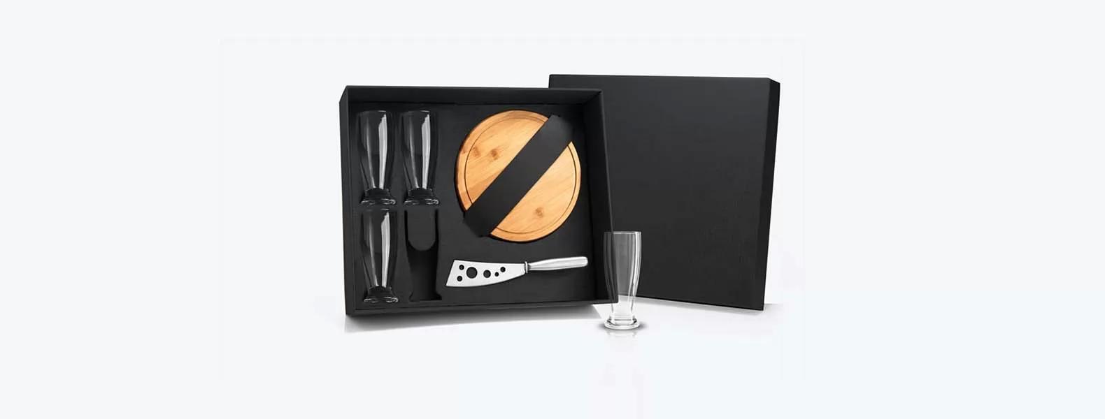 Kit para Queijo e Cerveja; Conta com tábua redonda para Queijo/Petiscos; Faca para frios em metal; Quatro copos para Cerveja em vidro. Estão perfeitamente acomodados em uma caixa para presentear. Dimensões do produto: Tábua: 21×1,2cm Embalagem: Caixa Preta Dimensões da embalagem: 460x410x130 mm (AxLxP) Peso da embalagem: 1.740 g
