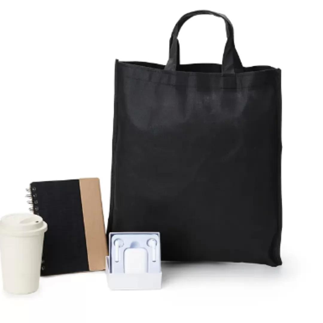 Esse kit conta com sacola preta em TNT com alças, caderno espiral preto/bege com capa e caneta em papelão reciclado rígido, copo em Fibra de Bambu / PP; fone de ouvido bluetooth com comandos touch, microfone, carregador de fechamento magnético e acompanha USB Lightning para carrega