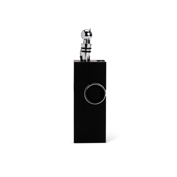 Kit vinho com seis peças em inox dispostas em um suporte organizador em MDF. O conjunto contém: tampa de bico, bico condutor com tampa, termômetro, saca-rolhas metálico com lâmina de corte e abridor de garrafa e dois wine collars.