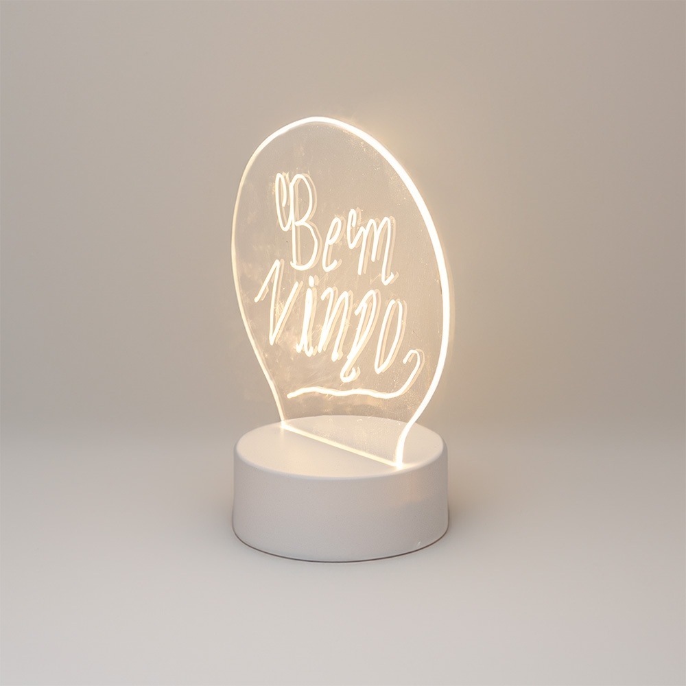 Muito mais do que uma luminária de mesa led, ela transforma qualquer ambiente, trazendo aconchego e um toque personalizado Com sua tela acrílica 3D, é possível soltar a criatividade e deixar mensagens inspiradoras, lembretes importantes ou até desenhos fofos, tudo de um jeito prático e super divertido! Com um funcionamento super simples, ela se conecta com cabo via USB integrado à base plástica ou por meio de 3 pilhas AAA (1.5V) não inclusas. Além disso, acompanha uma caneta plástica com apagador integrado, tornando a experiência ainda mais interativa e funcional. Essa luminária é perfeita para iluminar o ambiente e deixar recadinhos incríveis do seu jeito!