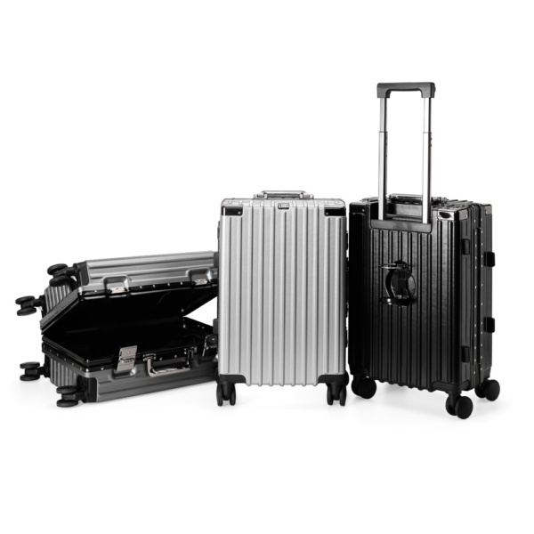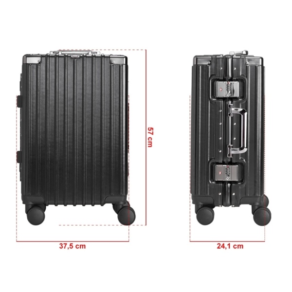 Mala de viagem 46 litros feita em plástico com acabamento em alumínio, contém cadeado numérico TSA. Compartimentos internos com bolso telado, bolso plástico para itens molhados e cinta compressora para roupas. A mala possui duas alças de mãos, puxador retrátil com regulagem de tamanho e suporte para celular, suporte porta bolsa, suporte para copo ou garrafa, quatro rodinhas 360º e apoios laterais.