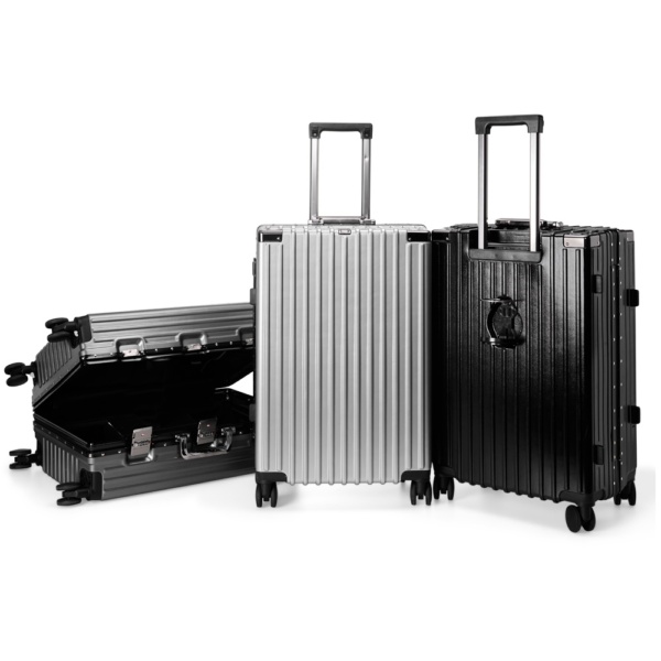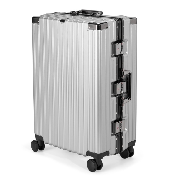 Mala de viagem 78 litros feita em plástico com acabamento em alumínio, contém cadeado numérico TSA. Compartimentos internos com bolso telado, bolso plástico para itens molhados e cinta compressora para roupas. A mala possui duas alças de mãos, puxador retrátil com regulagem de tamanho e suporte para celular, suporte porta bolsa, suporte para copo ou garrafa, quatro rodinhas 360º e apoios laterais.