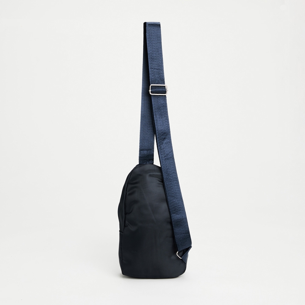 Mini bolsa confeccionada em tecido Oxford resistente à água e alça transversal ajustável em nylon. Possui dois compartimentos e um bolso interno, todos com fechamento em zíper, além de entrada para fones de ouvido e uma pequena placa metálica para personalização.