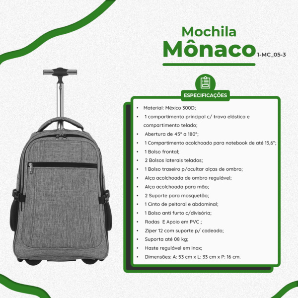 Sofisticação e Estilo é o que propõe a Mochila com Rodinhas Mônaco. Confeccionada em nylon de alta qualidade e acabamento reforçado nas costuras, o modelo conta com uma estrutura rígida que garante mais resistência ao produto e maior durabilidade.