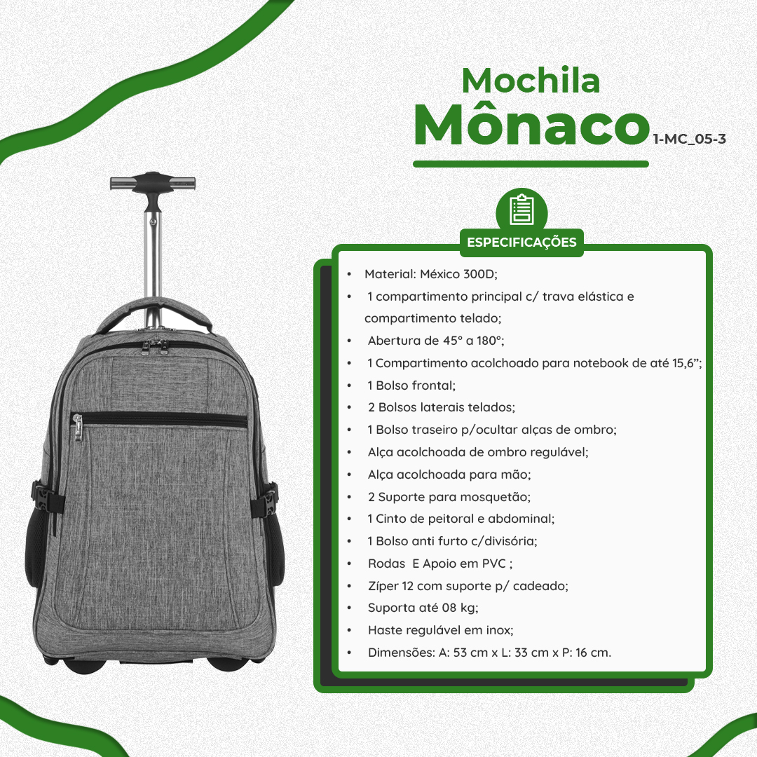 Sofisticação e Estilo é o que propõe a Mochila com Rodinhas Mônaco. Confeccionada em nylon de alta qualidade e acabamento reforçado nas costuras, o modelo conta com uma estrutura rígida que garante mais resistência ao produto e maior durabilidade.