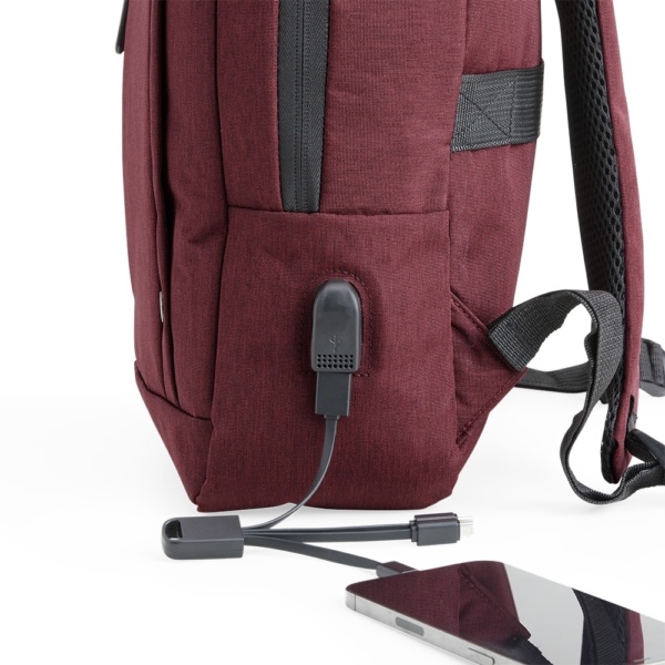 Mochila de nylon 21 Litros com dois compartimentos, sendo o principal com bolso para notebook 15,6. Com divisórias internas para acessórios, a mochila possui bolso lateral, suporte externo USB e alça para engate em malas de viagem.