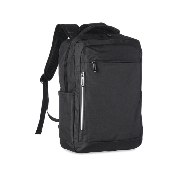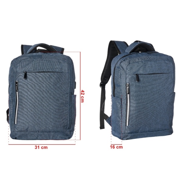 Mochila de nylon 20 litros com três compartimentos, sendo o principal com bolso para notebook 15,6. Com bolsos laterais e faixa frontal refletiva, a mochila possui adaptador USB externo, alça para encaixe em malas de viagem, duas alças de mãos e alças para as costas com revestimento espumado. Acompanha plaquinha metálica.