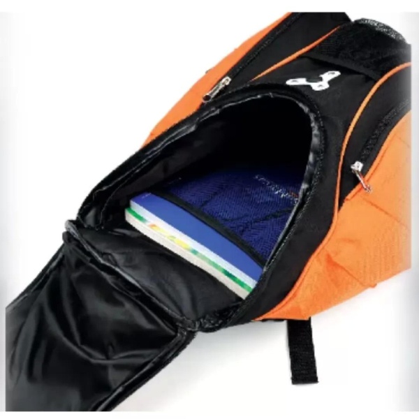 Mochila laranja e preta confeccionada em Polyester 300D. Conta com compartimento interno em tela, alças ajustáveis, três bolsos externos com zíper, sendo dois laterais e um frontal com divisória em tela elástica e orifício para fone de ouvido. Possui ainda alça de mão e um bolso frontal inferior em tela elástica. *IMAGEM ILUSTRATIVA, NÃO ACOMPANHA O PAR DE TÊNIS*