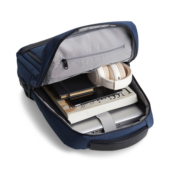 Mochila de Poliéster 29 litros com detalhes em couro sintético. A mochila possui 4 compartimentos, sendo o principal com bolso para notebook 15,6 polegadas. Contém divisórias internas para acessórios, bolso lateral, alça para engate em malas de viagem e suporte externo USB.