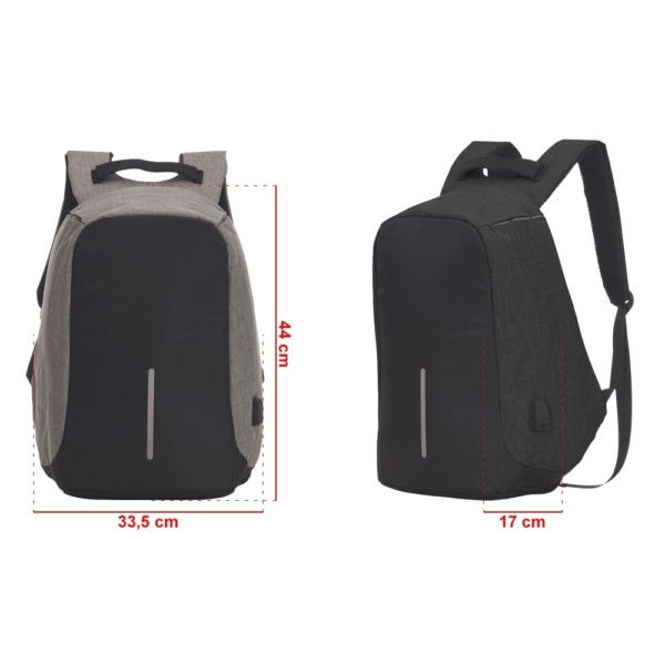 Mochila anti-furto de poliéster. Pensando na segurança do usuário foi confeccionado o compartimento principal na área traseira, impossibilitando a abertura do produto mesmo com a mochila na costa do usuário. Possui dispositivo com entrada USB na parte externa com cabo USB acoplado internamente; permitindo a conexão de um carregador portátil na área interna e a conexão de um eletrônico na área externa, viabilizando a carga e utilização do eletrônico enquanto caminha. Área interna do compartimento principal: bolso para notebook de 15,6 polegadas, bolso para tablet, quatro bolsos para acessórios, possui nas laterais internas sistema de velcro, maximizando a segurança da mochila. Parte frontal com faixa refletiva, alças para as costas ajustáveis revestidas com espuma para um maior conforto sendo uma delas com bolso de zíper, alça para mãos e alça horizontal para encaixe em malas de viagem.