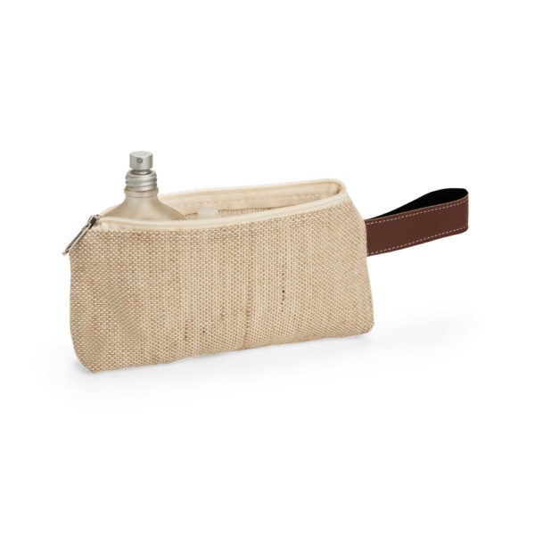 Nécessaire compacto feito em juta, alça de mão lateral em bidim e fechamento em zíper.