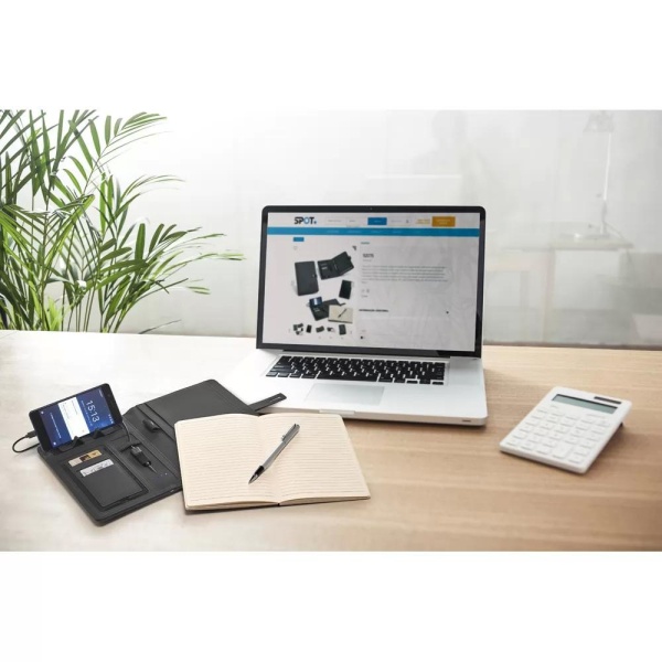 Pasta A5 em c. sintético com bateria portátil embutida (lítio). A bateria tem capacidade para 4.000 mAh, tempo de vida ? 500 ciclos com entrada/saída 5V/1A e cabo USB / micro USB para carregar a bateria. No interior, contém um caderno removível com 64 folhas pautadas de cor marfim, um suporte para esferográfica (não inclusa) e elásticos para organização e suporte para smartphone. No exterior, uma placa com acabamento emborrachado, LED interior e botão on/off. Fornecida em caixa presente. 165 x 225 x 25 mm | Placa: 55 x 35 mm | Caixa: 180 x 240 x 35 mm