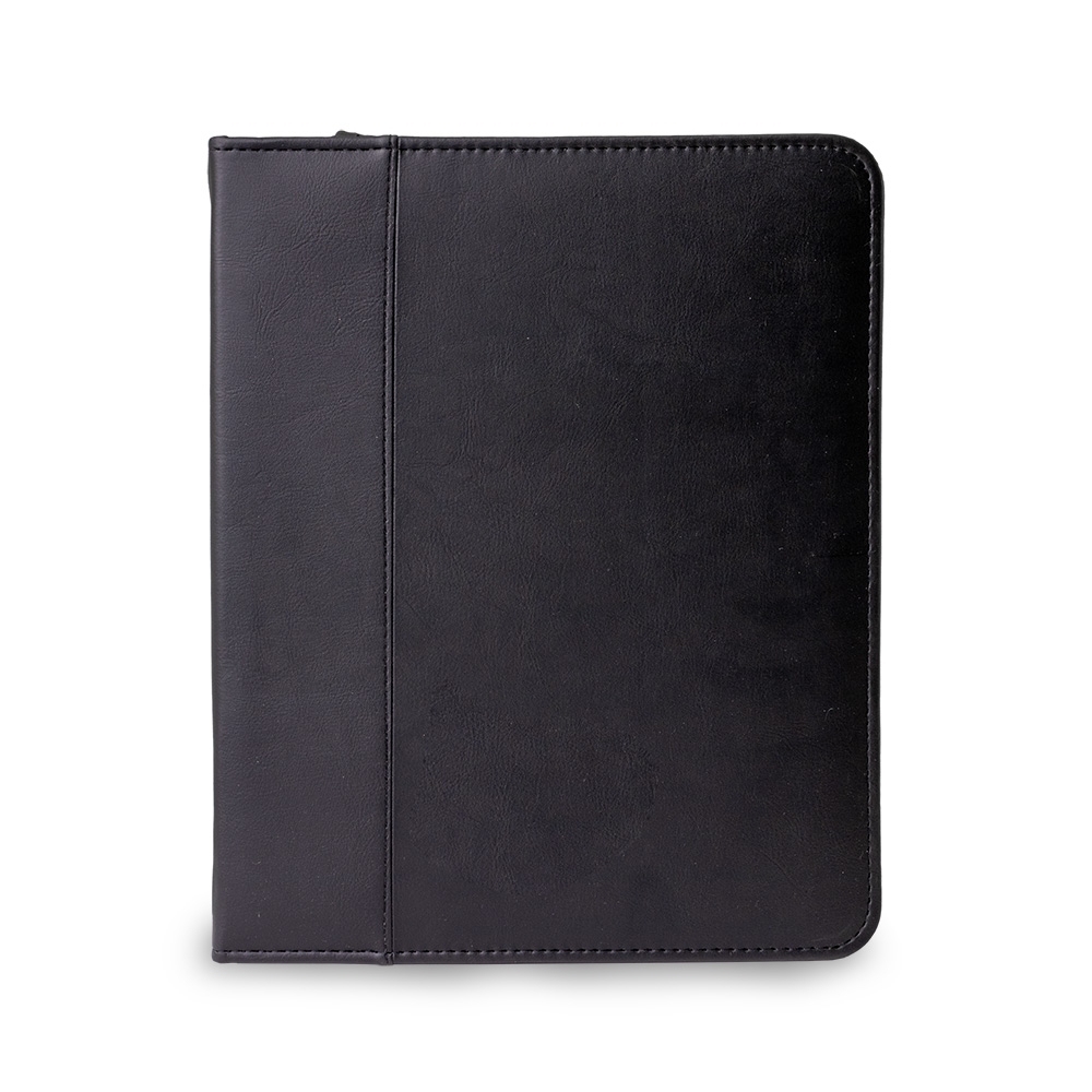 Pasta caderno de couro sintético com zíper. Possui 2 compartimentos para arquivar documentos e suporte para caneta (não acompanha caneta). A pasta contém caderno de capa dura em couro sintético, com aproximadamente 100 folhas.