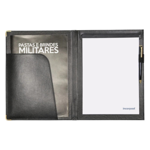 A Pasta Despacho com Bloco Incorpast substitui os envelopes plásticos e os envelopes de papel, ela foi criada para facilitar o seu dia a dia. A Pasta Despacho com Bloco Incorpast possui um suporte interno de papelão resistente para que possa ser utilizada como apoio e para evitar amassados, além de possuir porta canetas para que você tenha uma caneta ao seu alcance sempre que necessário. Fabricada em couro sintético de primeira linha a Pasta Despacho com Bloco Incorpast possui cantoneiras em metal, 1 bolsa interna, bloco de anotações com 50 páginas lisas e seu acabamento é feito em couro cortado. Personalize sua Logo em baixo relevo ou serigrafia. As pastas Despacho Incorpast oferecem a certeza do cuidado e zelo com a sua documentação!