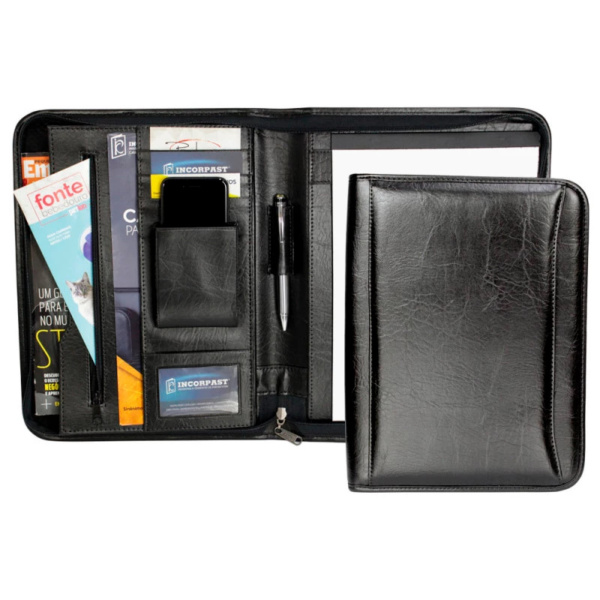 Leve seus documentos com mais organização com a Pasta Executiva Premium Incorpast. A Pasta Executiva Premium Incorpast possui 3 porta cartões, 1 porta celular/calculadora, 1 porta caneta, 1 bolso interno com zíper, 1 suporte para bloco, 2 bolsas internas (tamanhos diferentes), 1 bolso externa, visor de identificação interno e fechamento a zíper. Personalize sua Logo em baixo relevo ou serigrafia! Você ainda pode personalizar o produto de acordo com a sua necessidade incluindo abas internas, zíperes e alça. A Pasta Executiva Premium Incorpast garante mais facilidade no seu dia a dia.