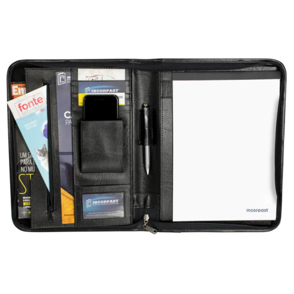 Leve seus documentos com mais organização com a Pasta Executiva Premium Incorpast. A Pasta Executiva Premium Incorpast possui 3 porta cartões, 1 porta celular/calculadora, 1 porta caneta, 1 bolso interno com zíper, 1 suporte para bloco, 2 bolsas internas (tamanhos diferentes), 1 bolso externa, visor de identificação interno e fechamento a zíper. Personalize sua Logo em baixo relevo ou serigrafia! Você ainda pode personalizar o produto de acordo com a sua necessidade incluindo abas internas, zíperes e alça. A Pasta Executiva Premium Incorpast garante mais facilidade no seu dia a dia.