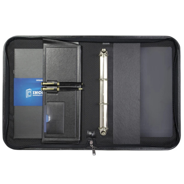 A Pasta Fichário em Couro Sintético Incorpast foi criada com o objetivo de auxiliar sua utilização, com a argola removível para que você possa retira-la no momento de utilização. Fabricada em Couro Sintético de primeira linha a Pasta Fichário em Couro Sintético Incorpast possui 2 porta canetas, 1 porta cartão e 1 bolsa interna para livro ou revista, com fechamento a zíper. Você pode adquirir Pasta Fichário em Couro Sintético Incorpast nas opções: 16441 com ferragem 4 argolas ou 16442 sem ferragem. Personalize sua Logo em baixo relevo ou serigrafia, leve essa facilidade para seus clientes!