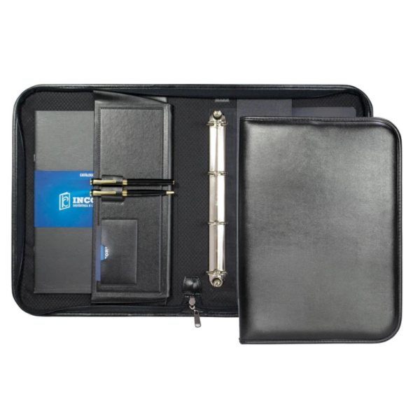 A Pasta Fichário em Couro Sintético Incorpast foi criada com o objetivo de auxiliar sua utilização, com a argola removível para que você possa retira-la no momento de utilização. Fabricada em Couro Sintético de primeira linha a Pasta Fichário em Couro Sintético Incorpast possui 2 porta canetas, 1 porta cartão e 1 bolsa interna para livro ou revista, com fechamento a zíper. Você pode adquirir Pasta Fichário em Couro Sintético Incorpast nas opções: 16441 com ferragem 4 argolas ou 16442 sem ferragem. Personalize sua Logo em baixo relevo ou serigrafia, leve essa facilidade para seus clientes!