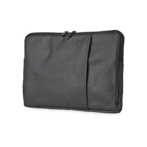 Pasta para notebook 14 em poliéster resistente à água com dois compartimentos, sendo o principal com interior forrado e almofadado.